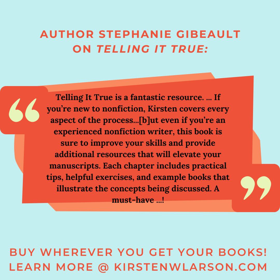 Hello friends! Big news! My next book is out now--Telling It True: Writing Nonfiction Kids (and Teens) Want to Read. Telling It True is both a prequel and companion to Reimagining Your Nonfiction Picture Book. While Reimagining zooms in on revising nonfiction picture books, Telling It True zooms out. It walks you through the full process of finding strong nonfiction ideas, researching effectively, and drafting engaging, fact-based books, no matter the format, from picture books through YA,...
